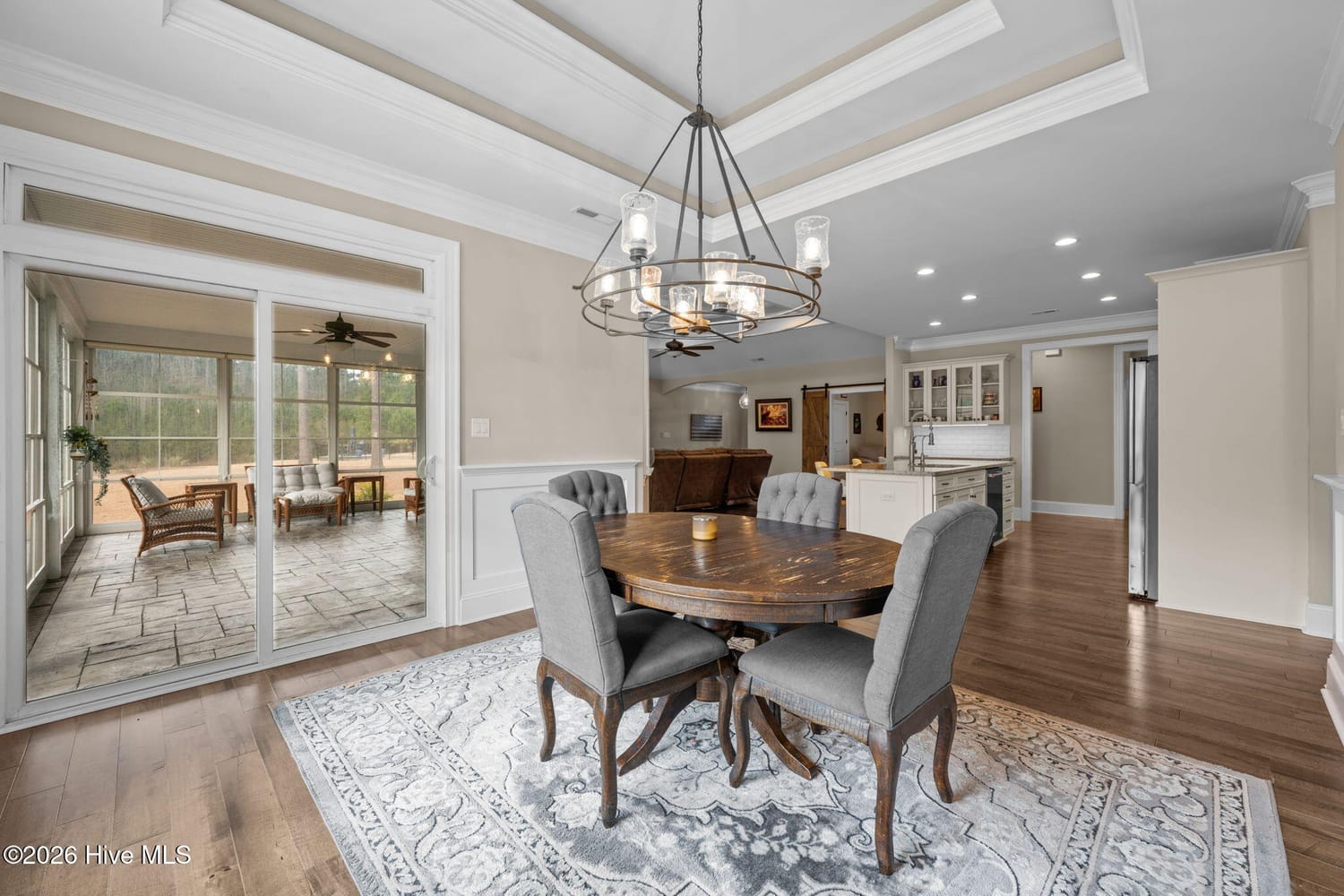 Just off the foyer, the formal dining room flows seamlessly into a spacious kitchen designed for both function and connection. Featuring custom cabinetry, granite countertops, a center island, breakfast bar, and sunny breakfast area, this kitchen is perfectly suited for busy mornings, casual meals, or entertaining. Adjacent to the kitchen is a charming Carolina Room that opens to a masonry deck with a retractable automated awning—creating an effortless transition between indoor and outdoor living, no matter the season.