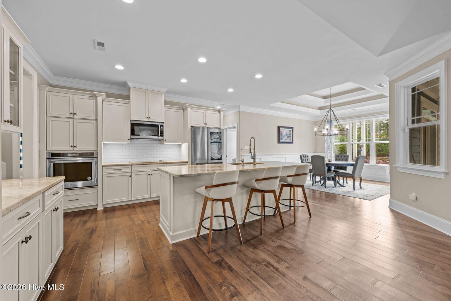 The oversized center island is ready for everything from quick school-day breakfasts to festive evening gatherings.