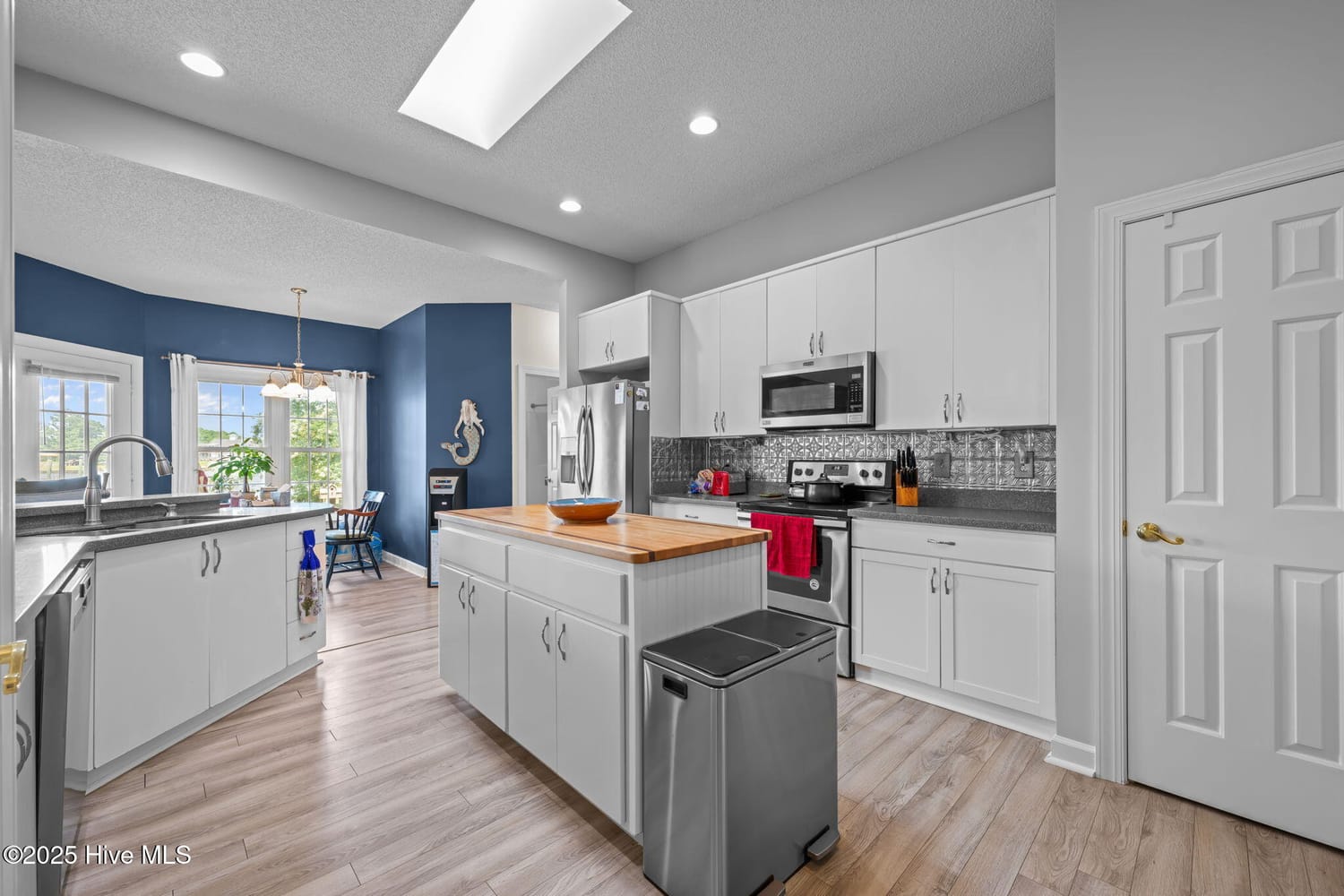 At the heart of the home, the living room offers warmth and elegance with its stunning fireplace, custom-built bookcases, and open flow into the formal dining area. Just beyond, the chef-inspired kitchen awaits — complete with custom cabinetry, induction range, built-in microwave, and a beautifully designed backsplash that reflects shimmering water views from the large picture window. Whether you’re cooking for family, entertaining friends, or prepping for a holiday gathering, this kitchen is built to impress.